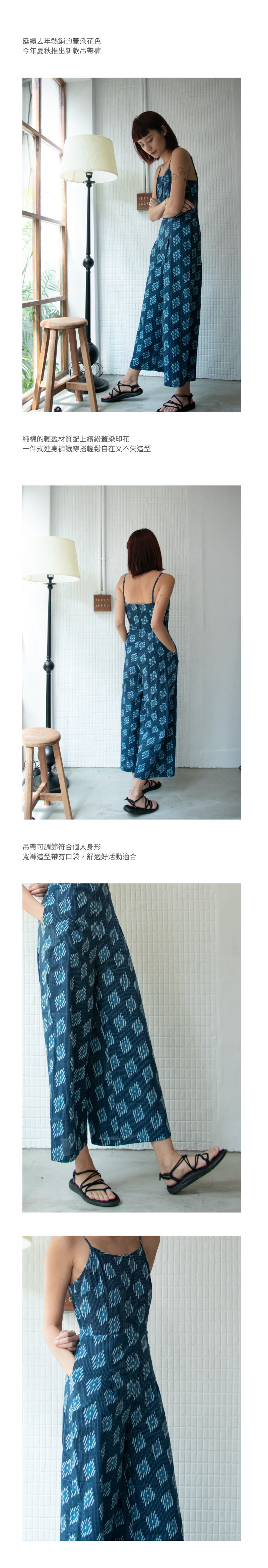 棉麻的輕盈材質配上繽紛蓋染印花,一件式連身褲讓穿搭輕鬆自在又不失造型