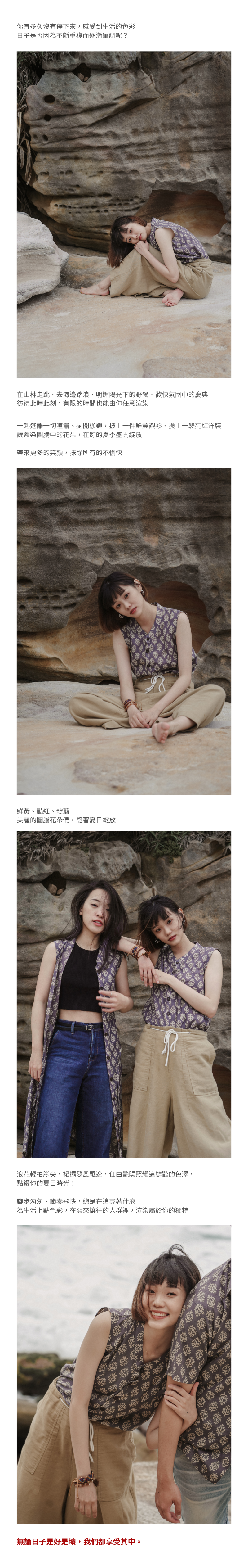 源自於 12 世紀的蓋染手工藝,經由整染、曝曬、蓋染等多道工法,搭配輕膚透氣的印度純棉,最用心的手蓋花紋,適合最認真出去玩的你。