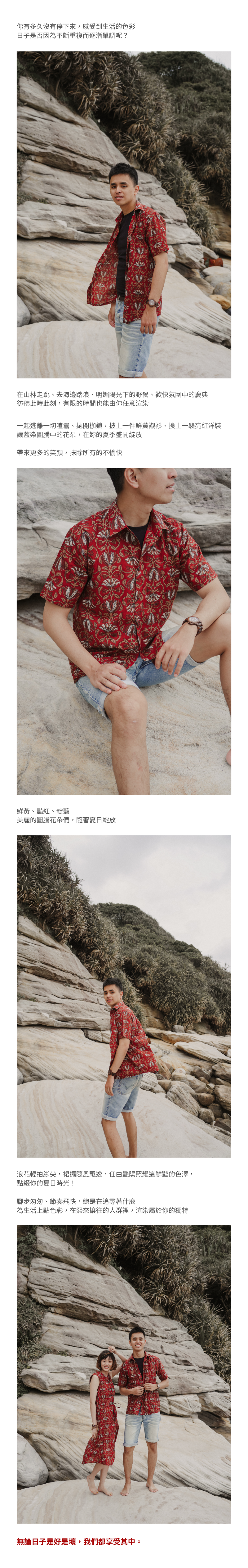 源自於 12 世紀的蓋染手工藝,經由整染、曝曬、蓋染等多道工法,搭配輕膚透氣的印度純棉,最用心的手蓋花紋,適合最認真出去玩的你。