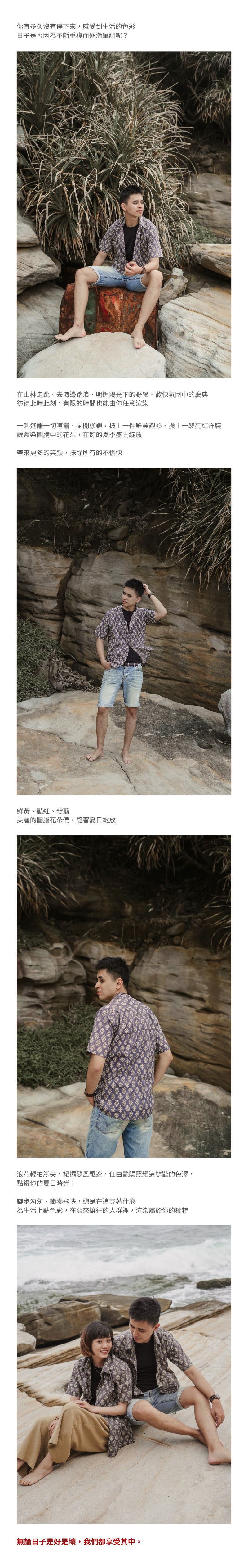 源自於 12 世紀的蓋染手工藝,經由整染、曝曬、蓋染等多道工法,搭配輕膚透氣的印度純棉,最用心的手蓋花紋,適合最認真出去玩的你。