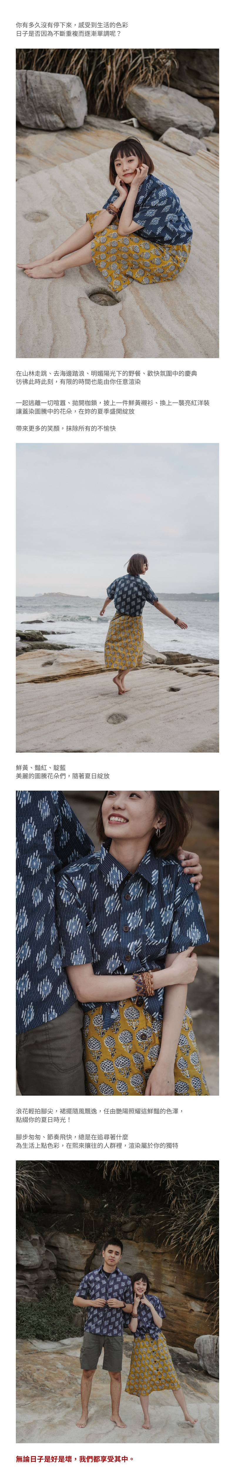 源自於 12 世紀的蓋染手工藝,經由整染、曝曬、蓋染等多道工法,搭配輕膚透氣的印度純棉,最用心的手蓋花紋,適合最認真出去玩的你。