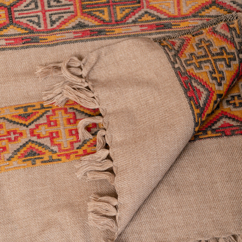 我們的氂牛毯是向印度的旁遮普邦遊牧民族收購製造,遊牧民族習慣手工將具有藏族意義的圖騰帶入編織元素裡,而氂牛這樣重要的角色更是在設計風格上扮演了不可或缺的角色。